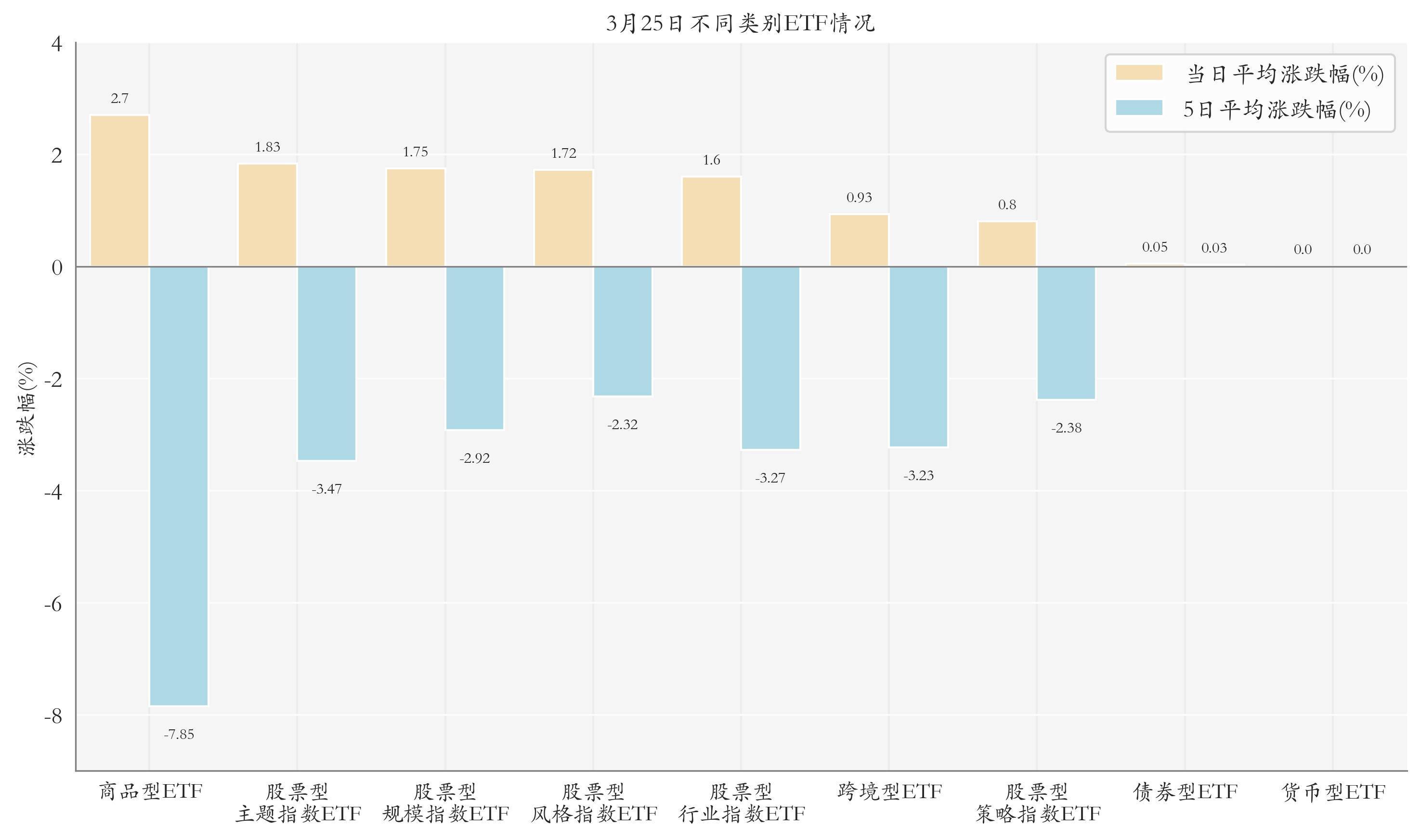 根据ETF基金的规模和涨跌幅计算得出不同分类情况下各类ETF基金的平均涨跌幅。