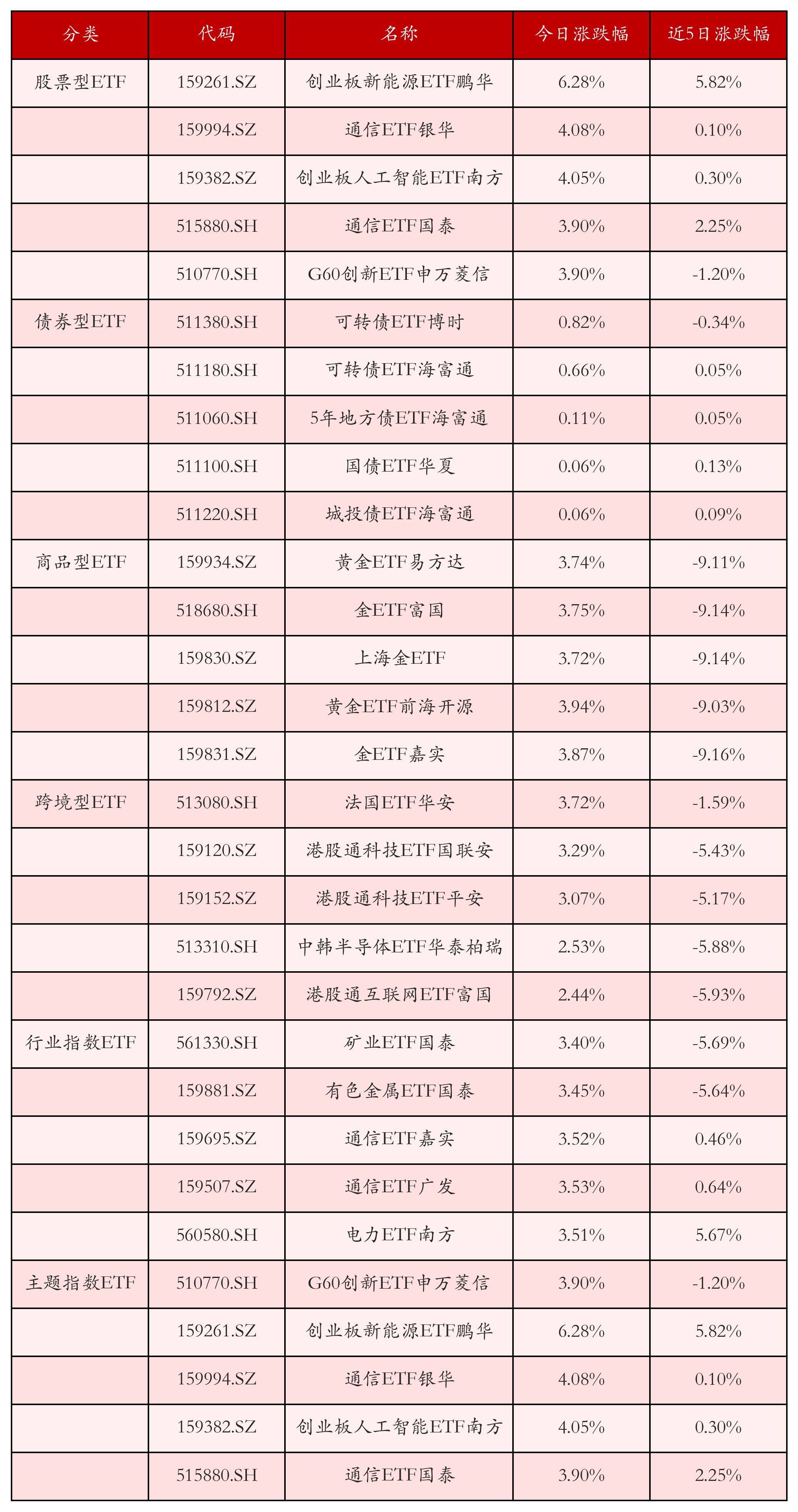 从不同投资种类、行业、主题的ETF产品中找出今日走势行情排名前5的ETF基金,今日涨幅靠前的ETF产品如下表所示。股票型ETF中涨跌幅排名前3位的ETF产品分别为创业板新能源ETF鹏华(159261.SZ)、通信ETF银华(159994.SZ)和创业板人工智能ETF南方(159382.SZ),今日收益率分别为6.28%、4.08%和4.05%。