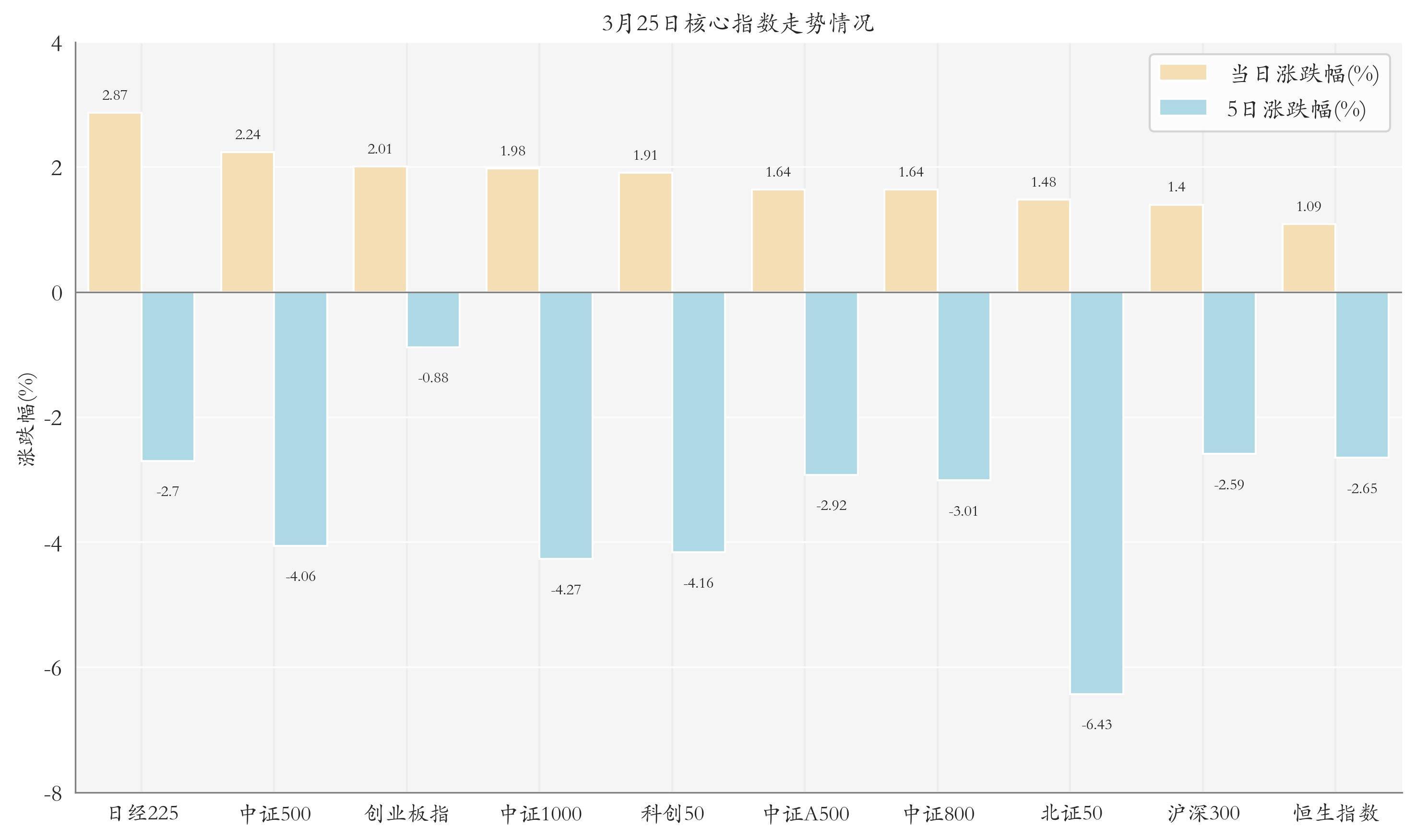 统计A股与海外主要核心指数走势,今日(3月25日,下同)三大指数集体上涨,其中上证指数上涨1.3%,收于3931.84点,日内最高3933.06点;深证成指上涨1.95%,收于13801.0点,日内最高13835.03点;创业板指上涨2.01%,收于3316.97点,日内最高3325.26点。今日日经225、中证500与创业板指走势排名靠前,日涨跌幅分别为2.87%、2.24%与2.01%;近5个交易日创业板指、沪深300与恒生指数的走势排名靠前,近5日涨跌幅分别为-0.88%、-2.59%与-2.65%。