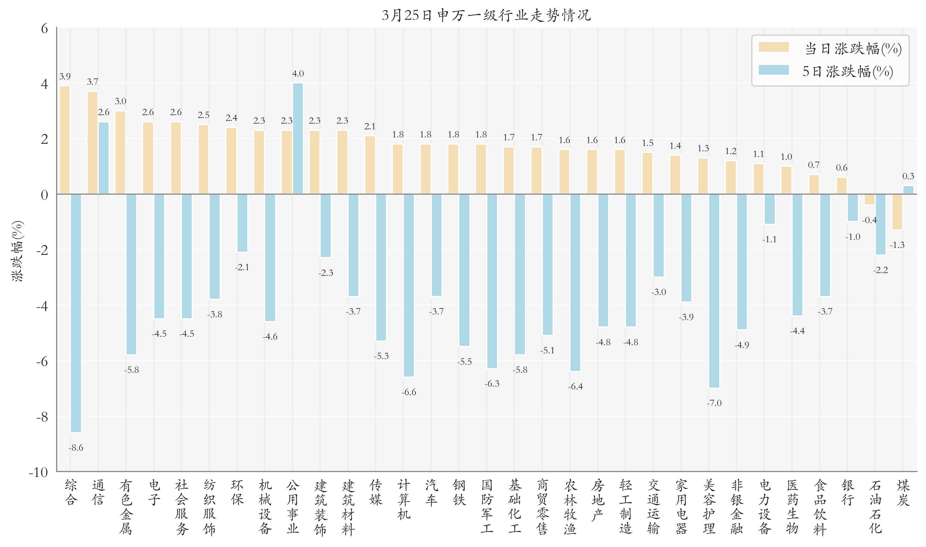 统计今日全部申万一级行业涨跌幅情况,综合、通信与有色金属今日走势排名靠前,日涨跌幅分别为3.87%、3.71%与2.97%,煤炭、石油石化与银行的走势排名靠后,日涨跌幅分别是-1.29%、-0.44%与0.65%;近5个交易日公用事业、通信与煤炭的走势排名靠前,近5日涨跌幅分别为4.02%、2.61%与0.33%,综合、美容护理与计算机的走势排名靠后,近5日涨跌幅分别为-8.64%、-6.98%与-6.55%。