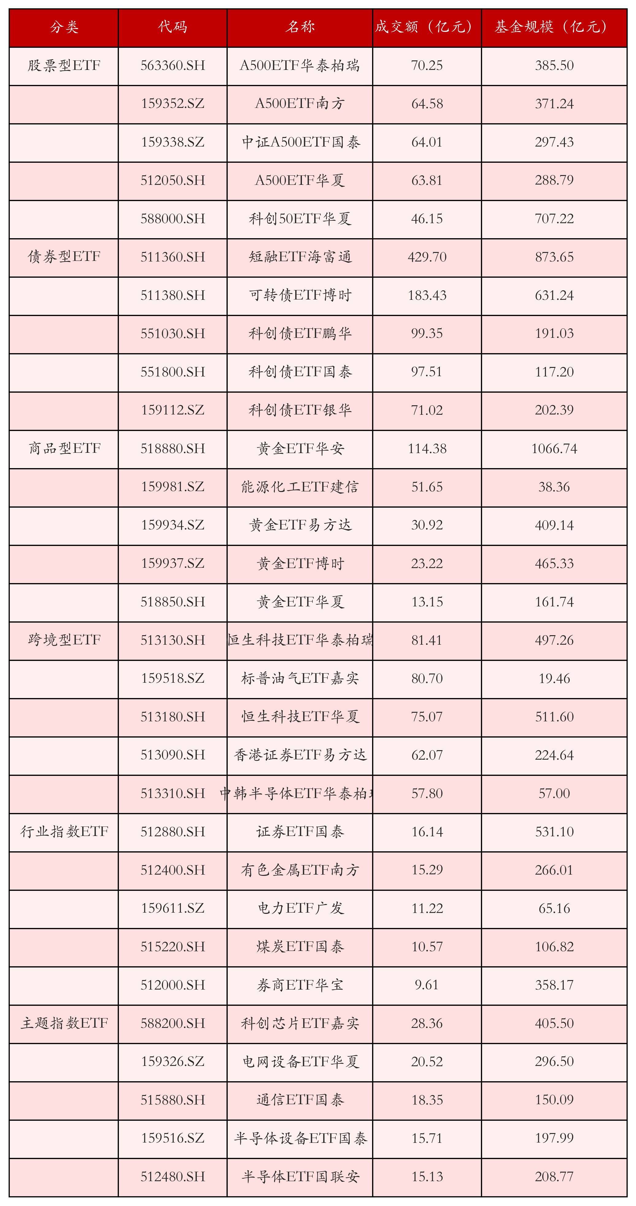 基于成交额对各类ETF今日的成交情况进行统计,成交额靠前的ETF产品如下表所示。股票型ETF中成交额排名前3位的ETF产品分别为A500ETF华泰柏瑞(563360.SH)、A500ETF南方(159352.SZ)和中证A500ETF国泰(159338.SZ),今日成交额分别为70.25亿元、64.58亿元和64.01亿元。